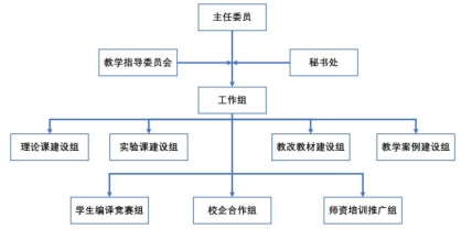 虚拟教研室聘请两位国家级教学名师何炎祥教授和蒋宗礼教授为指导专家。以工作组为基本单位,每个工作组由来自各单位的知名专家领衔,目前已建成的工作组有(括号内为组长和副组长):理论课程建设组(北航张莉、云南大学朱锐)、实验课程建设组(国防科大王挺,南京大学许畅)、教研和教材建设组(北理工计卫星,高等教育出版社倪文慧)、教学案例组(电子科技大学田玲、华东师范大学张敏)、校企合作组(中科院计算所冯晓兵,希翼公司李超、华为钱溢)、编译竞赛组(北航胡春明、北京大学刘先华)、教师培训和推广组(大连理工江贺,中科大张昱)等。各工作组之间分工明确、协同合作,形成了凝聚力和战斗力。设置秘书处,负责对接各个工作组,协助其开展活动。