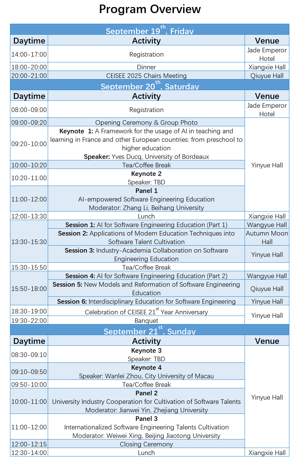 CEISEE 2025的主题为:“生成式人工智能赋能软件工程教育,全面提升学生胜任力”(“GenAI Empowers Software Engineering Education for Student Competency”)。大会将聚焦探索软件工程教育的创新路径,包括利用人工智能提升教学效果的策略、软件工程教育的新模式与改革、人工智能、大数据、云计算、物联网等新兴技术的跨学科教育,以及产学研合作、质量保障和专业认证等议题。CEISEE 2025旨在激励软件工程教育及IT人才培养领域的专家学者,共同迎接生成式人工智能与数字时代带来的挑战与机遇。